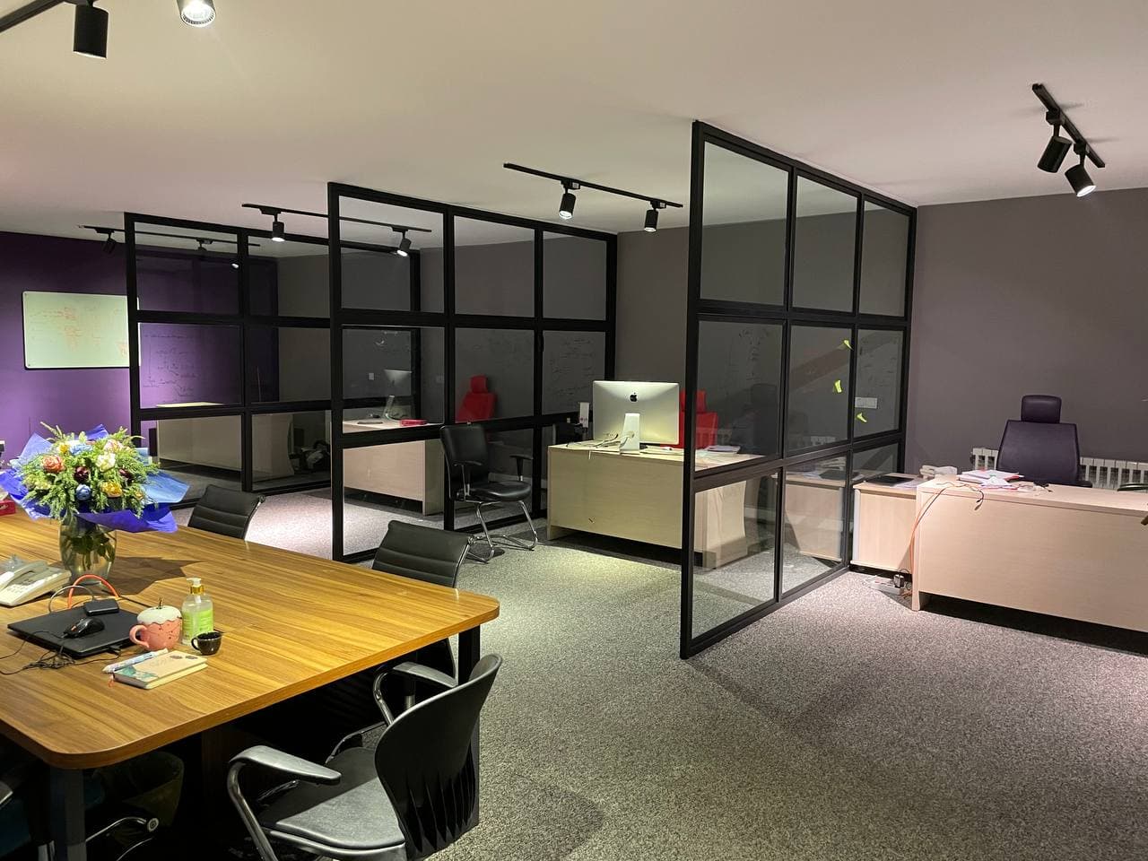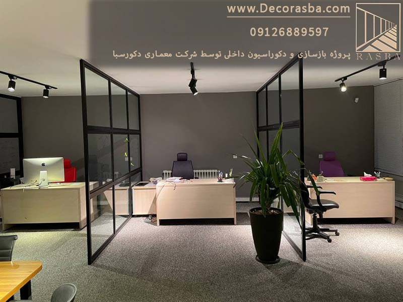 برای ایجاد حریم بین کارکنان ولی جهت جلوگیری از بسته و تاریک شدن فضا از دیوایدرهای شیشه ای استفاده شد.که کارمندان علاوه بر داشتن حریم و فضای مختص به خود میتونن روی این شیشه ها بنویسن.