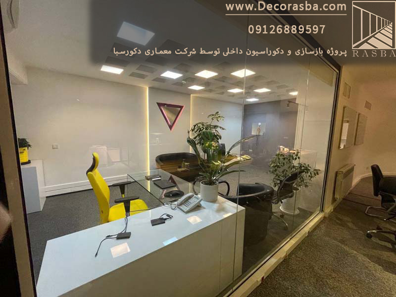 از رنگ بنفش و لوگوی ویژن به خوبی در پروژه استفاده شد . این فضای اداری دارای فضایی دوستانه و جذاب است که علاوه بر کاربردی بودن طراحی بسیار خاص و ویژه است.